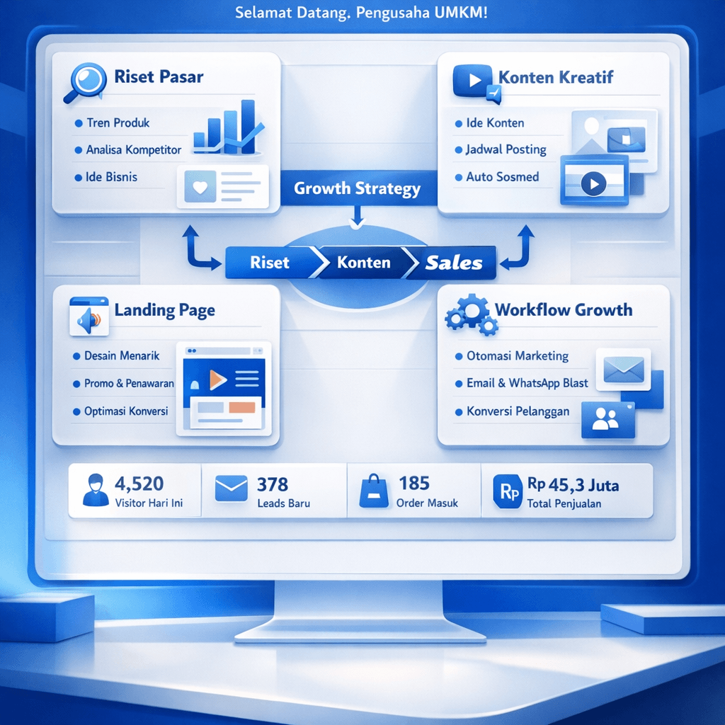 WOW Growth Engine membantu merapikan alur kerja dari riset market, produksi konten, landing page, order flow, sampai evaluasi. Bukan sekadar menghasilkan output, tapi membantu workflow yang bisa dipakai berulang.